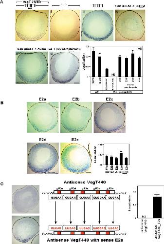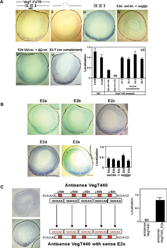 Figure 2. The E2s Are Necessary and Sufficient for VegT RNA Localization(A) VegT440 is necessary for localization; its localization requires the E2s but not the other repeated elements. The VegT 3â²UTR localizes to the vegetal pole (Ai). Deletion of VegT440 abolishes localization (Aii). VegT440 localizes similarly to the entire 3â²UTR (Aiii). When introduced into all five E2s, dinucleotide mutations (UUCACâUU