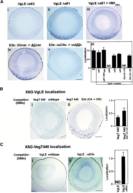 Figure 3. VegT440 and VgLE Compete in an E2-Dependent Manner for the Same Localization Factor(s) In Vivo(A) Reexamination—using the new assay—of the role of repeated elements in VgLE localization. As reported previously, deletion of all E2s completely blocks any sign of localized RNA (Ai). Deletions of the other repeated elements (δaE1 is shown) have far less of an effect on localization than previously thought (Aii and Avi). Deletion of the first two VM1s and mutation of the third VM1 to its reverse complement (UUUCUA→UAGAAA) has no effect on localization (Aiii and Avi). A dinucleotide mutation (UU