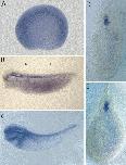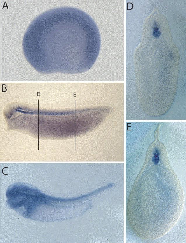 Fig. 3. FoxJ2. Panels AâC show the expression pattern of FoxJ2 at stages 23, 28, and 35, respectively. These panels are lateral views with anterior to the left. We sectioned and cleared a stained stage 28 embryo (D,E). The sections correspond to the lines drawn in panel B and are shown with the dorsal side up.