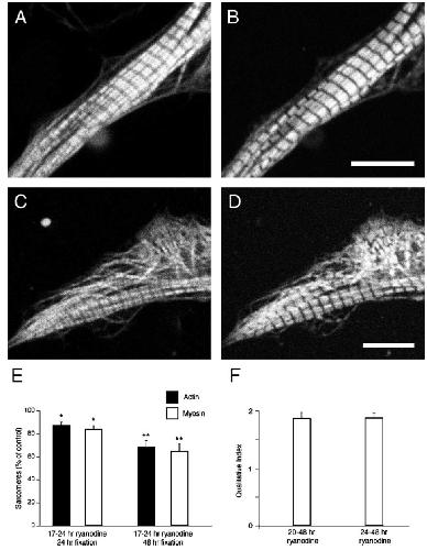 sometimes as much as 90- as seen in this cell. Scale bar inDis 10 Am. (E) Sarcomeric actin and myosin assembly in the presence of ryanodine [100 AM] from 17 to 24 h in
