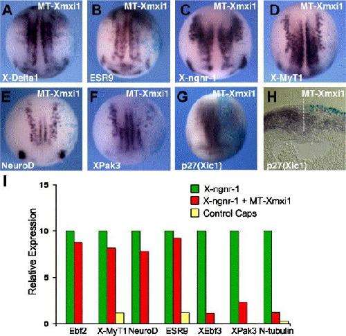 Fig. 6. Xmxi1 inhibits genes required for cell cycle withdrawal but does not influence neurogenic and early proneural genes. (AâG) Whole-mount in situ hybridization of stage 14 embryos injected with 500 pg of MT-Xmxi1. Antisense probes used are indicated in the lower lefthand corner. The injected side is always on the right, and all embryos are shown as dorsal views, anterior down. (H) Transversal section of G. (I) Xmxi1 blocks induction of late, but not early X-ngnr-1-induced target genes in animal caps. Real-time RT-PCR analysis of animal cap explants isolated from embryos injected with X-ngnr-1 (25 pg) alone or together with MT-Xmxi1 (500 pg). Expression levels were normalized to ODC and compared to the induction capacity of X-ngnr-1 injected animal caps, which were set to 10.