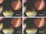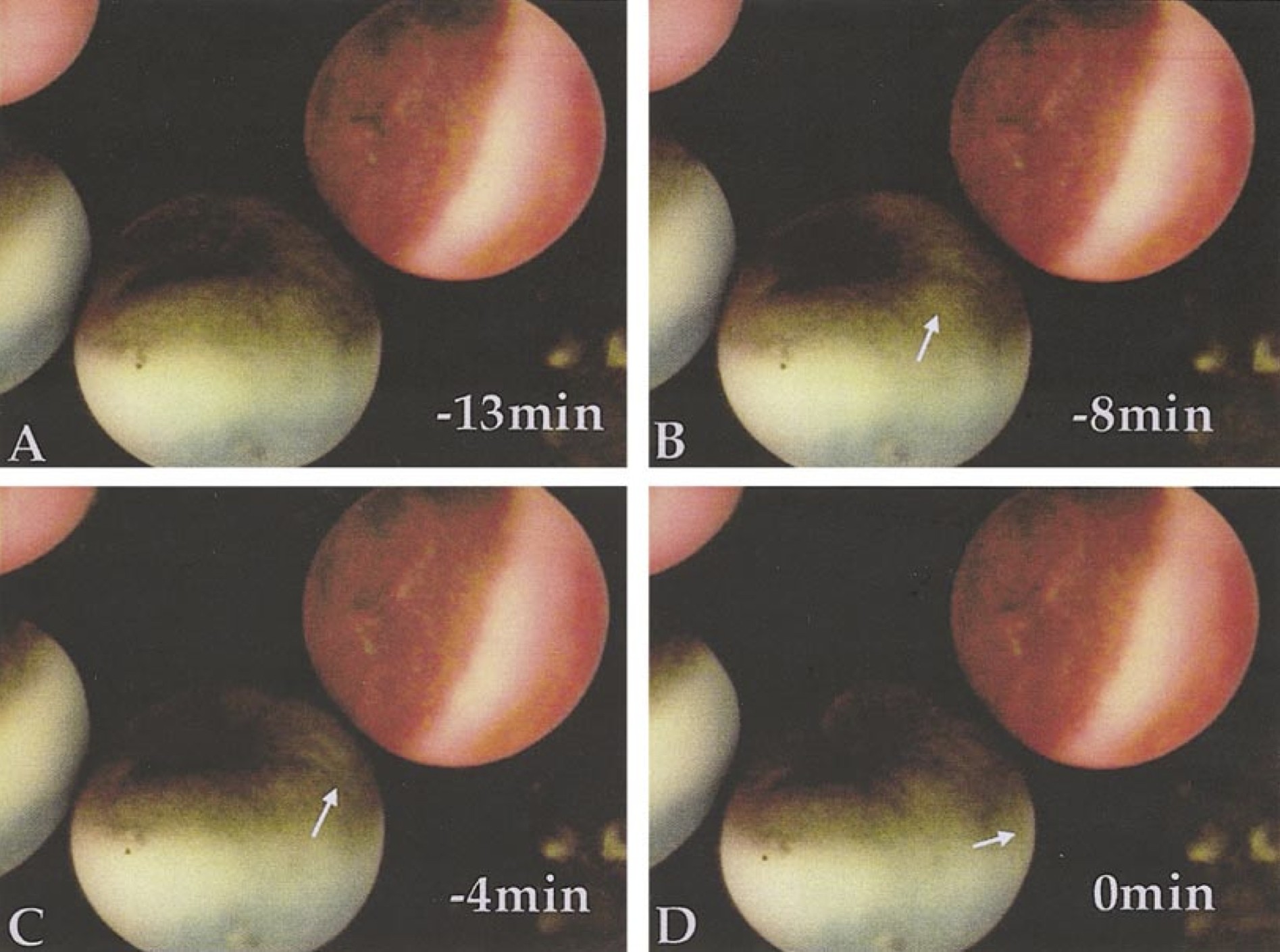 FIG. 5. Surface contraction wave passes in control egg (blue) but not in Xklp1-depleted egg (red) at end of the first cell cycle. (A) 12 min before cleavage furrow. Animal cap pigment is evenly pigmented. (B) 8 min before cleavage furrow. Wave moves outwards across animal cap, locally distorting the animal cortex and making the pigment lighter in color. The wave is marked by a blue line. (C) 4 min before cleavage furrow. Wave (blue line) has moved further outwards towards equator, and is now towards edge of animal cap. Outward distension of the cortical cytoplasm makes the pigment lighter. (D) Time of first cleavage furrow appearance. Wave has now reached equator. Pigment is now uniform over most of animal cap after passage of wave. Xklp1-depleted egg (red) does not show any change in shape or pigment pattern during this sequence of events in the blue one.