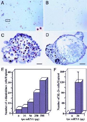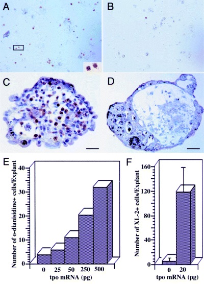 Figure 3. . Thrombopoietin (TPO) promotes expansion of both erythrocytes and leukocytes in the explants. (A,B) Erythrocyte expansion by tpo mRNA injection: embryos were injected with (A) rat tpo mRNA (250 pg) or (B) âmockâ mRNA (250 pg) at the 2-cell stage, and animal caps were excised at stage 8.5. The explants were analyzed by o-dianisidine staining. Smears of the cell suspension from the explants are shown. An enlargement of the boxed region in (A) is shown in the corner. (C,D) Leukocyte expansion by tpo mRNA injection: embryos were injected with (C) rat tpo mRNA (20 pg) or (D) âmockâ mRNA (20 pg) at the 2-cell stage and processed as described in (A). The explants were analyzed by immunostaining using the XL-2 antibody. The sections of the explants are shown. Bar, 50 μm. (E) The number of o-dianisidine-positive cells that appeared in the explants is shown. The experiments were repeated at least five times, and one of the typical results is shown. (F) The number of XL-2-positive cells that appeared in the explants is shown. The experiments were repeated at least three times, and one of the typical results is shown.