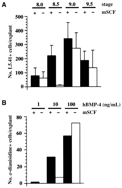 Figure 1. . Establishment of assay conditions for evaluating the effect of growth factors on the expansion of hematopoietic cells. (A) The optimal excision timing of animal caps to show the effects of mouse stem cell factor (mSCF) was examined. Animal caps were excised at the stages indicated and the explants were cultured with human activin A (0.5 ng/mL), human bone morphogenetic protein (hBMP)-4 (10 ng/mL), and with or without mSCF (30 ng/mL). Blood expansion was analyzed by immunostaining using the L5.41 antibody. (B) The optimal concentration of hBMP-4 to show the effects of mSCF was examined. Animal caps were excised at stage 8.5 and the explants were cultured as described in (A). Blood expansion was analyzed by o-dianisidine staining.