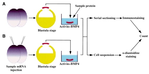 Figure 2. . Schematic diagram of the blood induction system from animal caps to investigate the role of growth factors in hematopoiesis. (A) The assay system for protein factors: animal caps were excised at the blastula stage and incubated with human activin A (0.5 ng/mL), human bone morphogenetic protein (hBMP)-4 (10 ng/mL), and sample proteins at 20°C for 4 days. The explants were analyzed by: (i) immunostaining: complete serial sections of the explants were stained using the L5.41 anti-larval globin monoclonal antibody or XL-2 anti-Xenopus leukocyte monoclonal antibody, and then brown stained cells in all sections were counted under a microscope; (ii) o-dianisidine staining: the explants were dispersed by collagenase and the cell suspension was stained with o-dianisidine, which binds to hemoglobin within erythrocytes. The cell suspension was applied onto glass slides and orange–brown cells were counted. (B) The assay system by mRNA injection: sample mRNA was injected into the animal pole of each blastomere at the 2-cell stage. Animal caps were excised at the blastula stage and processed as described in (A).