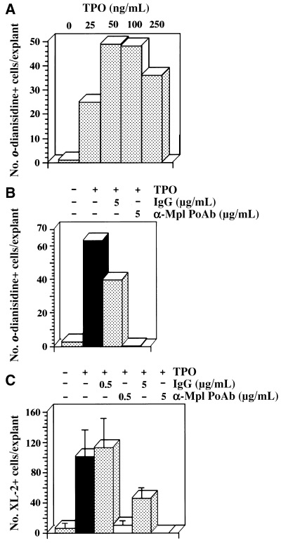 Figure 4. . Anti-c-Mpl antibody inhibits the expansion of hematopoietic cells in explants promoted by thrombopoietin (TPO). (A) The concentration of recombinant rat (rr)TPO for the expansion of hematopoietic cells was examined. The explants were cultured with the indicated doses of rrTPO in the presence of 0.5 ng/mL human activin A and 10 ng/mL human bone morphogenetic protein (hBMP)-4. The explants were analyzed by o-dianisidine staining. (B) Antihuman c-Mpl polyclonal antibody (α-Mpl PoAb), which neutralizes the activity of TPO in mammals, inhibited the erythrocyte expansion promoted by rrTPO. The explants were cultured with or without rrTPO (50 ng/mL) and α-Mpl PoAb in the presence of human activin A and hBMP-4, and they were analyzed by o-dianisidine staining. (C) α-Mpl PoAb inhibited the leukocyte expansion promoted by rrTPO. The explants were cultured as described in (B) and were analyzed by immunostaining using XL-2 antibody. These experiments were repeated at least four times (A) or three times (B,C) and one of the typical results is shown. IgG, rabbit IgG (control).