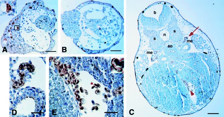 Figure 5. . Anti-c-Mpl antibody recognizes blood-like cells of Xenopus. Immunostaining using antihuman c-Mpl polyclonal antibody (α-Mpl PoAb) was done on explants and stage 43 embryos. Brown color indicates immunostaining. (A) Section of the explant treated with recombinant rat thrombopoietin (rrTPO) in the presence of human activin A and human bone morphogenetic protein (hBMP)-4, cultured for 4 days. An enlargement of the boxed region is shown in the corner. The c-Mpl-positive cells first appeared on day three and increased in number on day four. Bar, 50 μm. (B) Section of the explant treated without rrTPO in the presence of human activin A and hBMP-4 and cultured for 4 days. Bar, 50 μm. (C) A transverse section of a stage 43 embryo. Abbreviations: ao, aorta; b, brain; me, mesonephros; n, notochord; s, somite. Bar, 100 μm. (D) An enlargement of the region indicated with a red arrow in (C). Bar, 25 μm. (E) An enlargement of the region indicated with a red arrowhead in (C). An enlargement of the cell marked with an asterisk is shown in the corner. Bar, 25 μm.