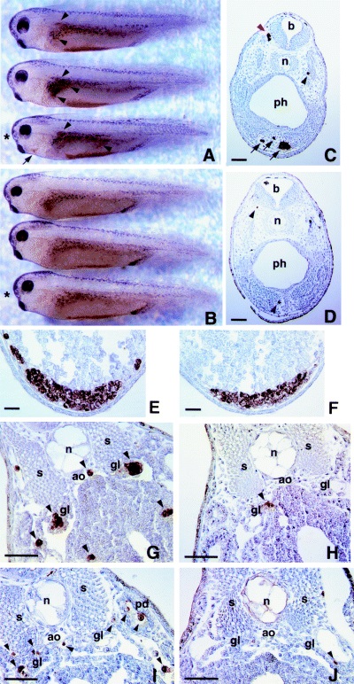 Figure 6. . Thrombopoietin (TPO) augments early hematopoiesis in Xenopus embryos. The embryos injected with tpo mRNA into the ventral marginal zone at the 4-cell stage were developed to stage 35/36 and were analyzed as follows. (A,B) Whole-mount o-dianisidine staining of the embryos processed as described in Materials and Methods. Brown o-dianisidine-positive cells indicate erythrocytes. (CâH) The sections of embryos labeled with an asterisk in (A) and (B) were analyzed by immunostaining using the L5.41 antibody. (C,D) Transverse sections of the region anterior to the heart indicated by an arrow in (A). Bar, 100 μm. (E,F) Transverse sections of ventral blood island (VBI). Bar, 25 μm. (G,H) Transverse sections of the dorsalâlateral plate (DLP) region. Bar, 50 μm. (I,J) The sections of embryos labeled with an asterisk in (A) and (B) analyzed by immunostaining using the XL-2 antibody. (I,J) Transverse sections of the DLP region. Bar, 50 μm. (A,C,E,G,I) Rat tpo mRNA (100 pg) injected embryo. (B,D,F,H,J) An uninjected embryo. Arrow and arrowheads indicate immunostaining on hematopoietic cells. Abbreviations: ao, aorta; b, brain; gl, glomus; me, mesonephros; ph, pharynx; n, notochord; s, somite.