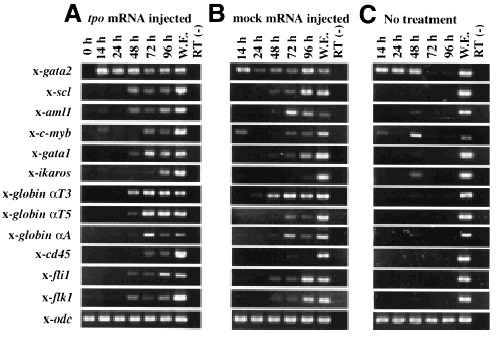 Figure 8. . Temporal expression patterns of hematopoietic transcription factors and markers in the explants. Expression patterns of hematopoietic transcription factors and markers were examined by reverse transcription (RT)âpolymerase chain reaction (PCR). (A) For the condition of the expansion of hematopoietic cells, embryos were injected with rat tpo mRNA (20 pg) at the 2-cell stage and the explants were cultured in the presence of 0.5 ng/mL human activin A and 10 ng/mL human bone morphogenetic protein (hBMP)-4. (B,C) Embryos were injected with âmockâ mRNA (20 pg) and the explants were cultured with 0.5 ng/mL human activin A and 10 ng/mL hBMP-4 for the condition of basal induction of hematopoietic cells (B) or cultured without growth factors for no induction of hematopoietic cells (C). Time course after the excision of animal caps is indicated above the gels. The genes indicated on the left side of the gel: x-gata-2, x-scl, and x-aml-1 are the early regulatory transcription factors of hematopoiesis; x-c-myb for multi-lineage progenitors; x-gata-1 for erythroid progenitors; and x-ikaros for lymphoid progenitors. The markers of mature hematopoietic cells: x-globin genes, αT3 (embryonic type), αT5 (larval type), and αA (adult type) for erythrocytes; x-cd-45 for common leukocytes. The markers of endothelial lineages: x-fli-1 for hemangioblast; x-flk-1 for vascular endothelial cells. x-odc is a positive control for RT-PCR. WE, whole embryo at stage 35/36; RT(â), the reactions that were done without reverse transcriptase.