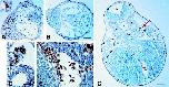 Figure 7. . Ectopic expression of thrombopoietin (TPO) promotes the heterotopic erythropoiesis in the head region of Xenopus embryos. The embryos injected with tpo mRNA into the ventral marginal zone at the 4-cell stage were developed to stage 35/36 and analyzed by immunostaining using the L5.41 antibody. Brown cells indicate immunostaining on erythrocytes. The transverse sections of uninjected embryos are shown in (AâC) and rat tpo mRNA (100 pg) injected embryos in (DâF). Bar, 250 μm. (GâI) shows enlargements of (DâF). Bar, 50 μm. Abbreviations: b, brain; n, notochord; ph, pharynx; s, somite.