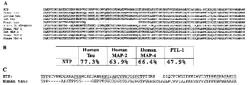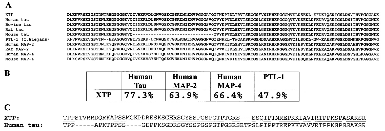 represented by human tau, MAP-2, -4 and invertebrate PTL-1. C, Alignment of the proline rich regions that precede the tandem repeats in both XTP and human