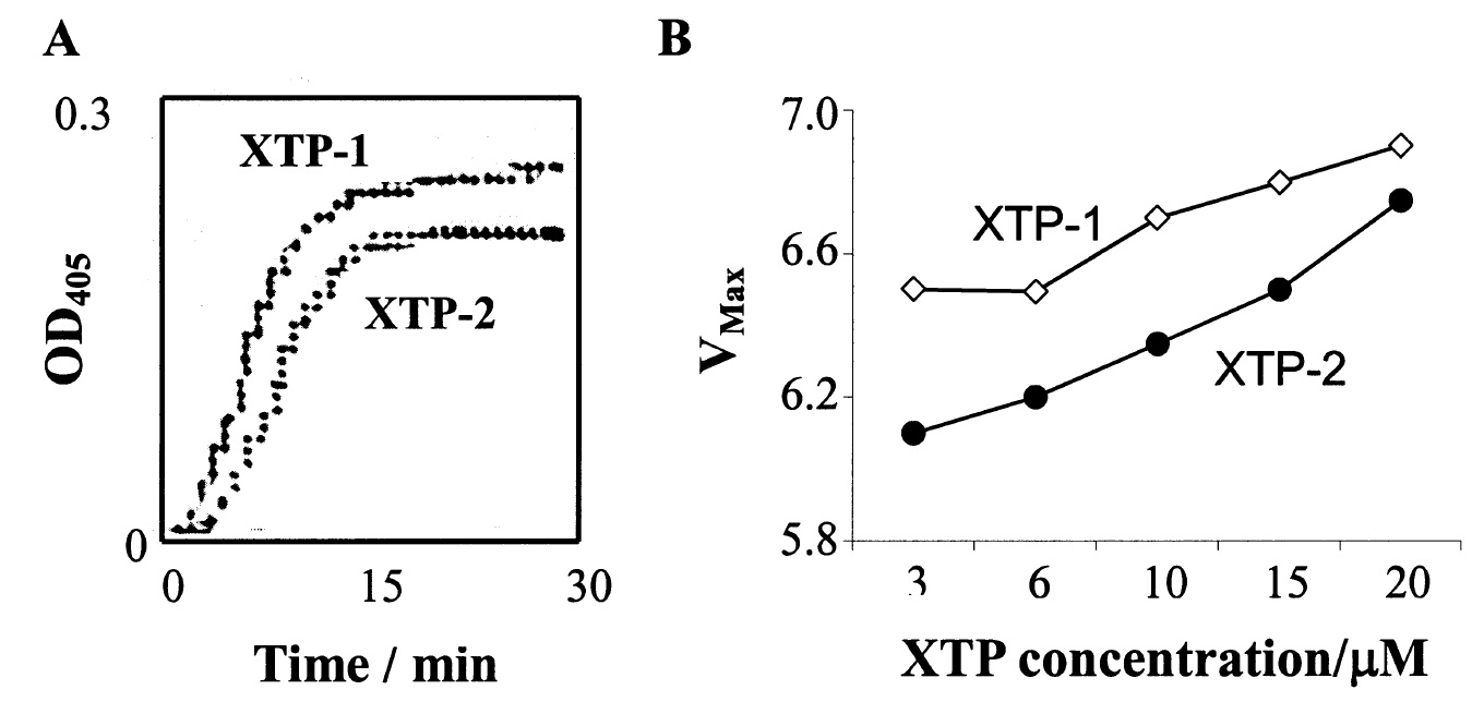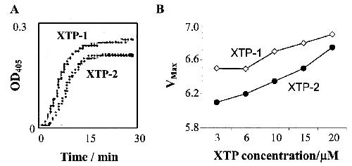 in turbidity at 405 nm. (A) The typical polymerisation of tubulin in the presence of 6 mM XTP-1 and -2 is shown. No change in turbidity was observed when