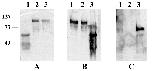 1, XTP-1; lane 2, XTP-2, and lane 3, human tau with 441 amino acids. C: Immunoblot of the recombinant proteins with a polyclonal antibody, HM-2, directed