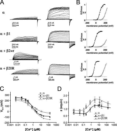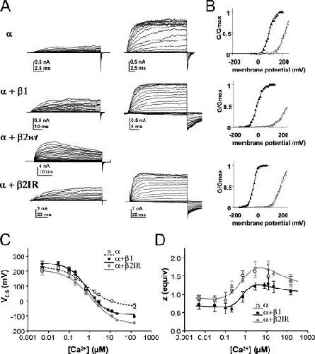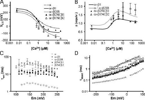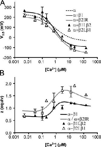 Figure 3. Steady-state activation parameters for α + β1Lβ2 and α + β2Lβ1 channels. (A) Average of the obtained V0.5 values plotted against calcium concentration. For α, α + β1, and α + β2IR only the best fit sigmoid concentration–effect curve (see Fig. 1 C) is depicted. (B) Average of the obtained z values plotted against calcium concentration. For α, α + β1, and α + β2IR only the best fit curve (see Fig. 1 D) is depicted. Error bars are SD, n = 5–6. When SD bars are not visible, they are smaller than symbol size.