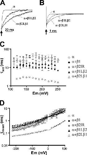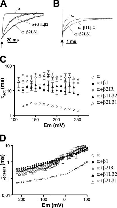 Figure 4. Effect of the β1Lβ2 and β2Lβ1 subunits on BK channel macroscopic kinetics in the absence of calcium. (A) Current traces evoked by a 200 mV pulse after a −80 mV prepulse. Over the traces, the best fit to an exponential raise is shown. Current magnitude of each trace was normalized by the steady-state current predicted by the fit. For α, the fit was extrapolated to show that the traces are effectively normalized to the same maximum. (B) Tail current traces evoked by a −60 mV pulse after opening the channels with a +200 mV activation pulse. Current magnitude of each trace was normalized by the peak of the tail current. Over the traces, the best fit to an exponential decay is shown. (C) Activation time constant (τact) plotted against activation voltage. Symbols represent mean ± SD. n = 7–10. (D) Deactivation time constant (τdeact) plotted against voltage. Symbols represent mean ± SD. n = 3–5. In the case of α, α + β1, and α + β2IR, only the mean is shown. Lines represent the best fit of a single exponential function to the data between −50 and +60 mV extrapolated from −80 to +100 mV.