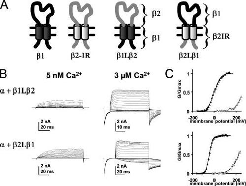 Figure 2. Effects of β1Lβ2 and β2Lβ1 subunits on BK channel steady-state activation parameters. (A) Schematic description of the β1Lβ2 and β2Lβ1 chimeras. (B) Macroscopic currents recorded in the inside-out configuration at 5 nM (left) and 3.3 μM (right) intracellular calcium, for α + β1Lβ2 (top) and α + β2Lβ1 (bottom) channels. The voltage protocols are as described in legend of Fig. 1. (C) Normalized G/V curves at 3.3 μM (closed symbols) and 5 nM Ca2+ (open symbols) for the current traces shown in B. Lines are the best fit of a Boltzmann distribution (Eq. 1). Fit parameters are as follows. α + β1Lβ2, V0.5 = 267 mV, z = 0.7 (5 nM); V0.5 = 2 mV, z = 0.92 (3.3 μM). α + β2Lβ1, V0.5 = 226 mV, z = 0.65 (5 nM); V0.5 = −42 mV, z = 1.7 (3.3 μM).