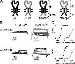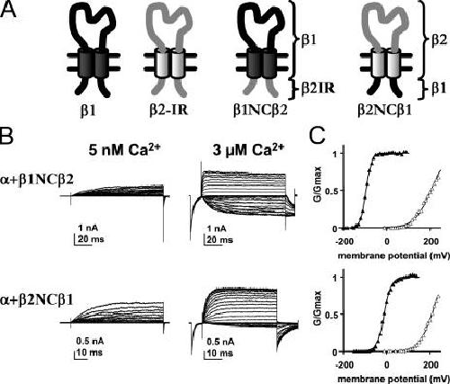 Figure 5. Effects of β1NCβ2 and β2NCβ1 subunits on BK channel steady-state activation parameters. (A) Schematic description of the β1NCβ2 and β2NCβ1 chimeras. (B) Macroscopic currents recorded in the inside-out configuration at 5 nM (left) and 3.3 μM (right) intracellular calcium, for α + β1NCβ2 (top) and α + β2NCβ1 (bottom) channels. The voltage protocols are as described in legend of Fig. 1. (C) Normalized G/V curves at 3.3 μM (closed symbols) and 5 nM Ca2+ (open symbols) for the current traces shown in B. Lines are the best fit of a Boltzmann distribution (Eq. 1). Fit parameters are as follows. α + β1NCβ2, V0.5 = 204 mV, z = 0.7 (5 nM); V0.5 = −95 mV, z = 2.0 (3.3 μM). α + β2NCβ1, V0.5 = 208 mV, z = 0.9 (5 nM); V0.5 = −10 mV, z = 1.5 (3.3 μM).