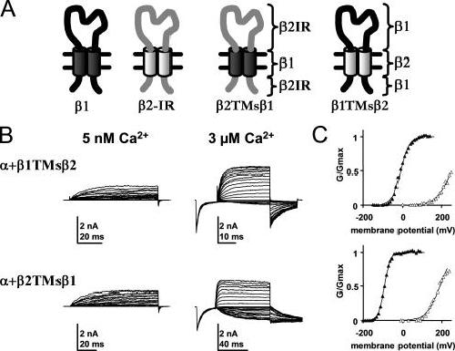 Figure 7. Effects of β1TMsβ2 and β2TMsβ1 subunits on BK channel steady-state activation parameters. (A) Schematic description of the β1TMsβ2 and β2TMsβ1 chimeras. (B) Macroscopic currents recorded in the inside-out configuration at 5 nM (left) and 3.3 μM (right) intracellular calcium, for α + β1TMsβ2 (top) and α + β2TMsβ1 (bottom) channels. The voltage protocols are as described in legend of Fig. 1. (C) Normalized G/V curves at 3.3 μM (closed symbols) and 5 nM Ca2+ (open symbols) for the current traces shown in B. Lines are the best fit of a Boltzmann distribution (Eq. 1). Fit parameters are as follows. α + β1TMsβ2, V0.5 = 251 mV, z = 0.7 (5 nM); V0.5 = −9 mV, z = 1.2 (3.3 μM). α + β2TMsβ1, V0.5 = 191 mV, z = 0.7 (5 nM); V0.5 = −90 mV, z = 1.7 (3.3 μM).