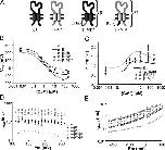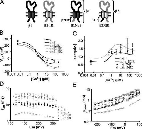 Figure 9. Activation parameters for α + β1Nβ2 and α + β2Nβ1 channels. (A) Schematic description of the β1Nβ2 and β2Nβ1 chimeras. (B) Average of the obtained V0.5 values plotted against calcium concentration. For α, α + β1, and α + β2IR, only the best fit sigmoid concentration–effect curve (see Fig. 1 C) is depicted. (C) Average of the obtained z values plotted against calcium concentration. For α, α + β1, and α + β2IR, only the best fit curve (see Fig. 1 D) is depicted. Error bars are SD, n = 4–6. Missing error bars are smaller than symbol size. (D) Activation time constant (τact) at 5 nM intracellular [Ca2+] plotted against activation voltage. Symbols represent mean ± SD. n = 4–11. (E) Deactivation time constant (τdeact) at 5 nM intracellular [Ca2+] plotted against voltage. Symbols represent mean ± SD. n = 4–6. In the case of α, α + β1, and α + β2IR, only the mean is shown. Lines represent the best fit of a simple exponential function to the data between −50 and +60 mV, extrapolated from −80 to +100 mV. The exponential factors expressed as electronic charges (z = slope×RT/F) are α + β1Nβ2, 0.28 ± 0.01; α + β2Nβ1, 0.34 ± 0.01.