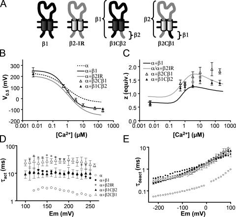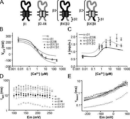 Figure 10. Activation parameters for α + β1Cβ2 and α + β2Cβ1 channels. (A) Schematic description of the β1Cβ2 and β2Cβ1 chimeras. (B) Average of the obtained V0.5 values plotted against calcium concentration. For α, α + β1, and α + β2IR, only the best fit sigmoid concentration–effect curve (see Fig. 1 C) is depicted. (C) Average of the obtained z values plotted against calcium concentration. For α, α + β1, and α + β2IR, only the best fit curve (see Fig. 1 D) is depicted. Error bars are SD, n = 9–11. Missing error bars are smaller than symbol size. (D) Activation time constant (τact) at 5 nM intracellular [Ca2+] plotted against activation voltage. Symbols represent mean ± SD. n = 8–12. (E) Deactivation time constant (τdeact) at 5 nM intracellular [Ca2+] plotted against voltage. Symbols represent mean ± SD. n = 4–8. In the case of α, α + β1, and α + β2IR, only the mean is shown. Lines represent the best fit of a simple exponential function to the data between −50 and +60 mV, extrapolated from −80 to +100 mV. The exponential factors expressed as electronic charges (z = slope×RT/F) are α + β1Cβ2, 0.29 ± 0.01; α + β2Cβ1, 0.43 ± 0.01.