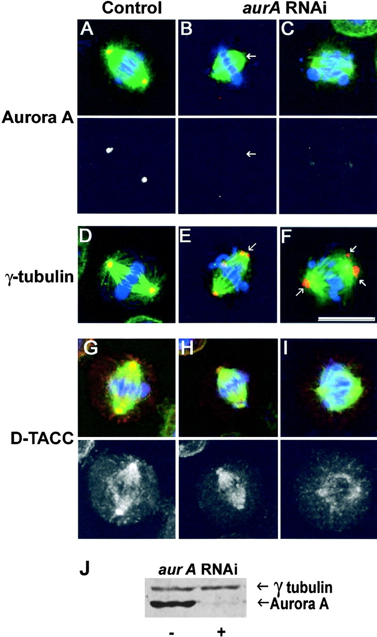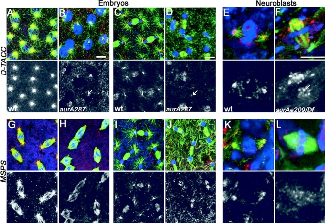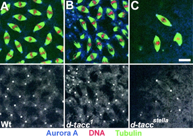 Disruption of the function of the A-type Aurora kinase of Drosophila by mutation or RNAi leads to a reduction in the length of astral microtubules in syncytial embryos, larval neuroblasts, and cultured S2 cells. In neuroblasts, it can also lead to loss of an organized centrosome and its associated aster from one of the spindle poles, whereas the centrosome at the other pole has multiple centrioles. When centrosomes are present at the poles of aurA mutants or aurA RNAi spindles, they retain many antigens but are missing the Drosophila counterpart of mammalian transforming acidic coiled coil (TACC) proteins, D-TACC. We show that a subpopulation of the total Aurora A is present in a complex with D-TACC, which is a substrate for the kinase. We propose that one of the functions of Aurora A kinase is to direct centrosomal organization such that D-TACC complexed to the MSPS/XMAP215 microtubule-associated protein may be recruited, and thus modulate the behavior of astral microtubules.