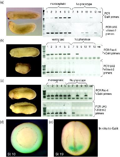 Figure 3 Microcephalic and ventralized phenotypes result from transactivation of Xvent-2 by Gal4 in three independent crosses. (a) CMVGal4 line 1 Ã UASXvent-2 line 5. (b) Pax-6Gal4 line 1 Ã UASXvent-2 line 4. (c) Pax-6Gal4 line 1 Ã UASXvent-2 line 6. (aâc Left) F1 stage 30 embryos showing the characteristic microcephalic or ventralized phenotype (Lower) when compared to an apparently normal sibling (Upper). (Right) PCR genotyping of individual embryos with the indicated phenotype. PCR primer combinations are indicated. âve, PCR control without DNA. (d and e) Half of F1 progeny from Pax-6Gal4 line 1 Ã wild type express Gal4 as revealed by in situ hybridization to Gal4 RNA. (d) At stage 10, Gal4 is expressed throughout the marginal zone of the embryo. (e) At stage 19, Gal4 expression is restricted to the eye field in the anterior neural plate.