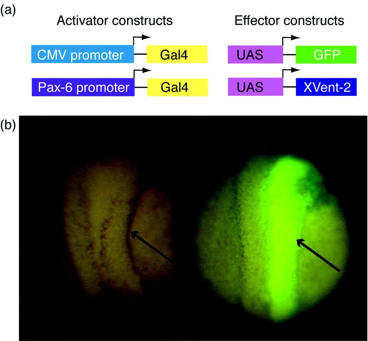 Figure 1 (a) Schematic diagram showing the activator and effector constructs used in this study. Activator constructs contain the yeast transcriptional activator Gal4 under the control of the ubiquitously expressed CMV promoter or the tissue-specific Pax-6 promoter. Effector constructs contain five repeat concatemers of the consensus binding site for Gal4 (UAS), linked to the hsp70 minimal promoter and the gene of interest, green fluorescent protein (GFP) or Xvent-2. (b) F1 progeny from effector lines were tested for the transmission of the transgene and transactivation by Gal4. Embryos were injected into one cell at the two-cell stage with 100 pg of Gal4 mRNA. Two stage 19 sibling F1 embryos from GUASGFP line 2 injected with Gal4 mRNA (arrow). GFP fluorescence is observed in the rightembryo on its right side, and that embryo is deemed to have inherited the UASGFP transgene, which has been transactivated by Gal4. The embryo on the left shows no GFP fluorescence and is assumed not to have inherited the transgene.