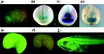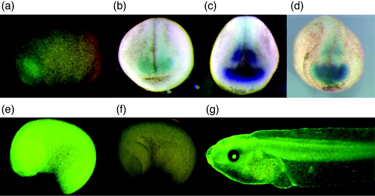 Figure 2 GFP is transactivated by Gal4 in temporally and spatially restricted manners on cross-fertilization of founder activator and effector lines. (aâc) Pax-6Gal4 line 2 Ã UASGFP line 2. (a) GFP fluorescence is restricted to the eye field in a stage 25 F1 embryo. GFP RNA (b) or Gal4 RNA (c) as detected by in situ hybridization is expressed in the anterior neural plate and presumptive hindbrain and spinal cord in stage 19 F1 embryos. (d) Stage 19 F0 embryo transgenic for Pax-6GFP showing the expression of GFP RNA driven by the Pax-6 promoter. (eâg) CMVGal4 line 1Ã UASGFP line 6. (e) Stage 25 F1 embryo expressing GFP ubiquitously. (f) Sibling stage 25, F1 embryo not expressing GFP. (g) Stage 40, F1 tadpole expressing GFP ubiquitously.
