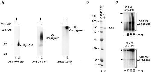 Figure 1. Chfr is a ubiquitin ligase. (A) Myc–Chfr (lanes 2) and control vector (lanes 1) were transfected into HEK293T cells and immunoprecipitated by an anti-Myc antibody. The immunoprecipitates were analyzed by Western blotting with an anti-Myc antibody (panel I) or with an anti-ubiquitin antibody (panel II). In addition, immunoprecipitates were incubated with radioactive ubiquitin in the presence of recombinant E1 and Ubc4 and assayed for ubiquitin ligase activity (panel III). The molecular weight markers for panels I–III are labeled on the left side of panel I. (B) Purified recombinant Chfr protein assayed by 12% SDS-PAGE. (C) Recombinant Chfr, at indicated final concentrations, was incubated with radioactive ubiquitin in the presence of E1 and Ubc4. The kinetics of the formation of the Chfr–Ub conjugates was assayed by 12% reducing SDS-PAGE. The arrows point to the wells of the stacking gel and the arrowheads indicate the junction between stacking and separation gels.