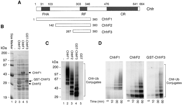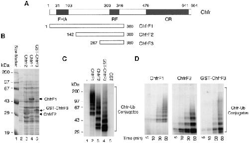 Figure 2. The ring finger domain is sufficient to mediate the auto-ubiquitination reaction. (A) A schematic diagram for the domain structure of the Chfr protein and the deletion constructs used in this paper. (B) Chfr deletion mutants were expressed in E. coli and their expression levels were assayed by 12% SDS-PAGE. Lane 2, lysates of E.coli without Chfr mutant proteins. (C) Equal amounts of E. coli lysates expressing various recombinant proteins were incubated with radioactive ubiquitin in the presence of recombinant E1 and Ubc4 and the formation of ubiquitin conjugates was analyzed by reducing SDS-PAGE. (D) Purified ChfrF1 (400 μg/ml final concentration), ChfrF2 (400 μg/ml), and GST–ChfrF3 (200 μg/ml) were incubated with radioactive ubiquitin in the presence of recombinant E1 and Ubc4 and the kinetics of ubiquitin conjugate formation was analyzed.