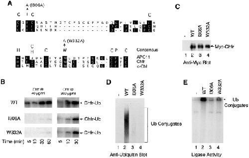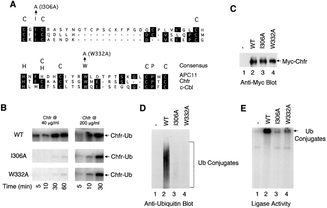 Figure 3. The ring finger domain is required for the Chfr ligase activity. (A) Alignment of the ring finger domains from APC11, Chfr, and c-Cbl. (B) Purified recombinant Chfr, ChfrI306A, and ChfrW332A, at concentrations indicated, were incubated with radioactive ubiquitin in the presence of E1 and Ubc4, and the kinetics of ubiquitin conjugate formation was followed by reducing SDS-PAGE. At the Chfr concentrations used here, all the ubiquitin conjugates stayed in the wells of the stacking gel and therefore only that portion of the gel is shown. (C–E) Myc–Chfr (lanes 2), Myc–ChfrI306A (lanes 3), Myc–ChfrW332A (lanes 4), and control vector (lanes 1) were transfected into HEK293T cells and immunoprecipitated by an anti-Myc antibody. The immunoprecipitates were analyzed by Western blotting with an anti-Myc antibody (C) or with an anti-ubiquitin antibody (D). In addition, immunoprecipitates were incubated with radioactive ubiquitin in the presence of recombinant E1 and Ubc4 and assayed for ubiquitin ligase activity (E). Arrow in E points to the wells of the stacking gel.