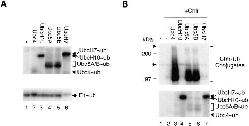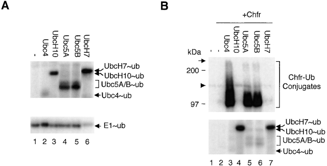 Figure 4. Chfr functions with Ubc4 and Ubc5, but not with UbcH7 and UbcH10. (A) A thioester assay for the activity of recombinant ubiquitin-conjugating enzymes. Recombinant E2s were incubated with E1 and then analyzed by nonreducing SDS-PAGE for E1 and E2s conjugated to ubiquitin through a thioester bond. Lane 1, E1 alone. (B) Purified recombinant Chfr (lanes 2–7) was incubated with radioactive ubiquitin in the presence of E1 and various E2s. The formation of the ubiquitin–Chfr conjugates was analyzed by reducing SDS-PAGE (top) and the formation of ubiquitin–E2s conjugates linked through a thioester bond was assayed by nonreducing SDS-PAGE (bottom). Under the reaction conditions, all the Chfr–Ub conjugates entered the separating gel. Arrow indicates the junction between the stacking and separating gels. Arrowhead points to an E1–Ub conjugate that is also present in control lanes (1 and 2). Lane 1, E1 alone. Lane 2, E1 and Chfr.
