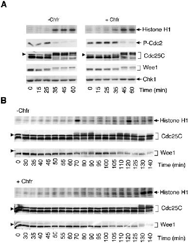 Figure 7. Chfr prolongs the phosphorylated state of Tyr15 in Cdc2 at the G2-M transition. (A) Xenopus interphase extracts were incubated with a buffer or Chfr. Δ90 cyclin B was then added and the activation of the Cdc2 kinase was analyzed by measuring the phosphorylation of histone H1. The kinetics of entry into mitosis was also measured by the level and the phosphorylation state of Cdc2, Cdc25C, Wee1, and Chk1 in Western blot analysis. Arrowheads point to nonspecific, cross-reacting bands. (B) Xenopus cycling extracts were incubated with a buffer or Chfr and the kinetics of entry into mitosis was measured by the Cdc2 kinase activity and by the phosphorylation state of Cdc25C and Wee1. Arrowheads point to nonspecific, cross-reacting bands.