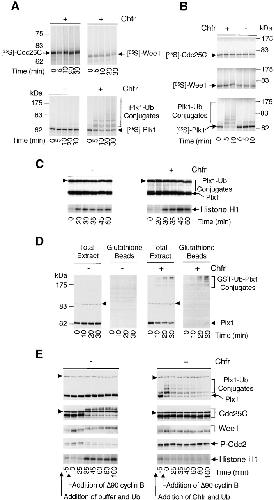 Figure 8. Plk1 is the substrate of Chfr ligase. (A) In vitro–translated Cdc25, Wee1, and Plk1 were incubated with Xenopus interphase extracts and ubiquitin, either in the presence or absence of recombinant Chfr, and the ubiquitination of these proteins was analyzed by SDS-PAGE. (B) In vitro–translated Cdc25, Wee1, and Plk1 were incubated with recombinant E1, E2, ubiquitin, and ATP, either in the presence or absence of recombinant Chfr, and the ubiquitination of these proteins was analyzed by SDS-PAGE. (C) Xenopus interphase extracts were incubated with a buffer or Chfr. Δ90 cyclin B was then added and the kinetics of the activation of the Cdc2 kinase was analyzed by measuring the phosphorylation of histone H1. Duplicated samples were analyzed in Western blot with an antibody against Xenopus Plx1. Arrowheads point to nonspecific, cross-reacting bands. (D) Xenopus interphase extracts were incubated with GST–Ub plus a buffer or Chfr. Samples were collected at various time points to directly blot against an anti-Plx1 antibody. In addition, GST–Ub conjugates were purified with glutathione beads and then assayed by Western blot analysis using the anti-Plx1 antibody. Arrowheads point to nonspecific, cross-reacting bands. (E) Xenopus interphase extracts were incubated with recombinant ubiquitin (at 2 mg/ml) plus a buffer or Chfr for 5 min. Δ90 cyclin B was then added and the kinetics of entry into mitosis was measured by the Cdc2 kinase activity and by the phosphorylation state of Cdc2, Cdc25C, and Wee1. The degree of ubiquitination of Plx1 was assayed by Western blotting with an anti-Plx1 antibody. Arrowheads point to nonspecific, cross-reacting bands.