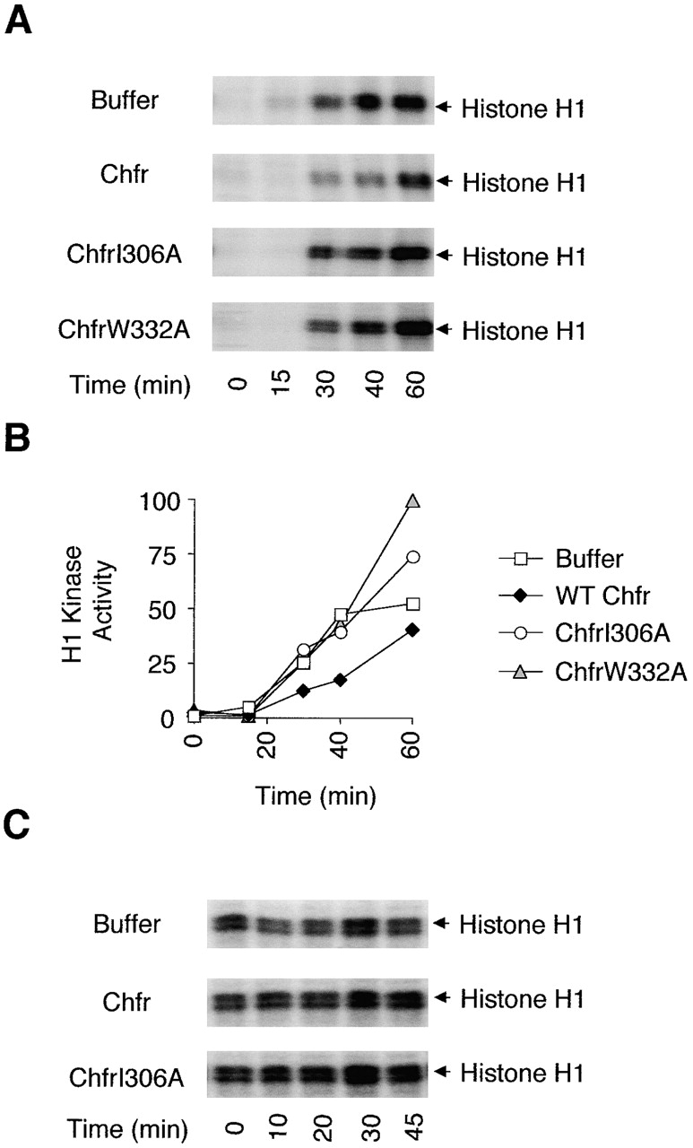 Figure 5. Chfr delays the activation of the Cdc2 kinase at the G2-M transition. (A and B) Xenopus interphase extracts were incubated with a buffer, Chfr, ChfrI306A, or ChfrW332A. Δ90 cyclin B was then added and the kinetics of the activation of the Cdc2 kinase was analyzed by measuring the phosphorylation of histone H1 with radioactive γ-ATP. The Cdc2 kinase activity was quantitated and plotted against time (B). The unit for kinase activity is arbitrary. In five separate experiments, the wild-type Chfr protein always delayed the activation of Cdc2 kinase. The levels of the Cdc2 activity at 60 min, from extracts treated with ChfrI306A and ChfrW332A, were slightly variable; in some experiments, these levels were close to, instead of higher than, that of the buffer control. (C) Xenopus mitotic extracts were incubated with a buffer, Chfr, or ChfrI306A, and the level of the Cdc2 kinase activity was analyzed using histone H1 as a substrate.