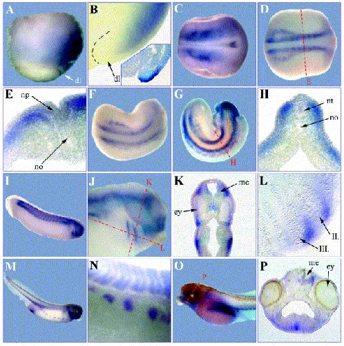 Fig. 3. Whole mount in situ hybridisation with FoxD2. (A) Stage 11, lateral view. (B) Inner view of an embryo (stage 11) cut into two halves. The insert shows a sagittal section through the dorsal blastopore lip of an embryo after whole mount in situ hybridisation for Xbra and DAPI staining of nuclei. (C) Stage 15. (D) Stage 17. (E) Transverse section of D. (F) Stage 21. (G) Stage 25. (H) Transverse section of G. (I) Stage 27. (J) Stage 29. (K) Transverse section of J. (L) Horizontal section of J. (M) Stage 36. (N) Higher magnification of the lateral region at stage 36. (O) Stage 41. (P) Transverse section of stage 41. All embryos, except for O, are orientated with anterior to the right. (C, D, F, G): dorsal view. (I, J, M, N, O): lateral view. dl: dorsal lip, ey: eye, me: mesencephalon, no: notochord, np: neural plate, nt: neural tube, II. and III.: second and third visceral pouch. Red dotted lines denote the planes of sections.