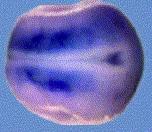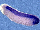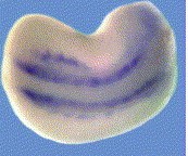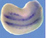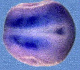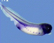 foxd1 () gene expression in Xenopus laevis embryo via in situ hybridization, NF stage 13 (top), anterodorsal view, dorsal up, and NF stage 20/21 (bottom) lateral view, anteriorleft, dorsal up.