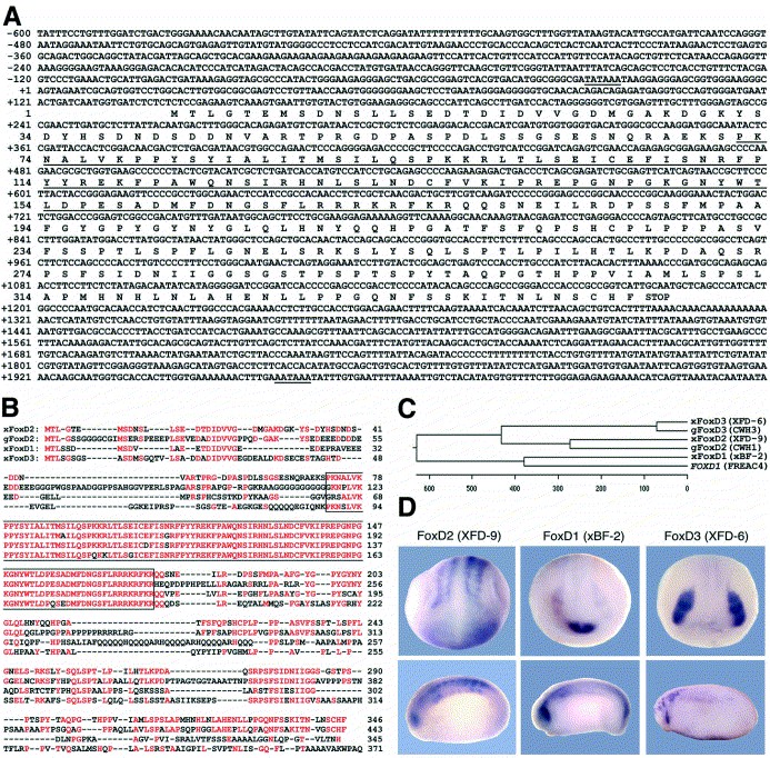 Fig. 1. Sequence of X. laevis FoxD2. (A) Nucleotide and derived amino acid sequences. The sequence has been deposited under EMBL accession number AJ344435. The TATA box, the polyadenylation signal and the fork head/winged helix domain are underlined. (B) Sequence alignment of X. laevis (x) FoxD2 with chicken (g) FoxD2, X. laevis FoxD1 and FoxD3. Identical aa residues are shown in red, deletions are indicated by dashes. (C) Phylogenetic tree for X. laevis FoxD1 (xBF-2; AJ011652), FoxD2, FoxD3 (XFD-6; AJ298865), human FOXD1 (FREAC4; U59831), chicken FoxD2 (CWH1; U37272) and FoxD3 (CWH3; U37274) (DNAstar program using J. Hein method with PAM 250). (D) Comparative whole mount in situ hybridisation for FoxD1, FoxD2 and FoxD3 during (upper; anterior view) or after completion of neurulation (lower; lateral view), respectively.