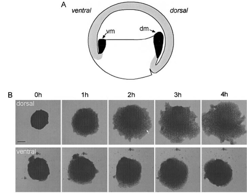mesendoderm (vm). Grey area: prospective ectoderm and posterior mesoderm. (B) Time lapse sequence of a dorsal and a ventral explant of
