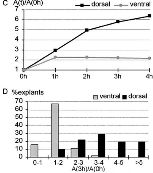 size [A (0h)]. (D) Spreading behaviour of dorsal and ventral groups of cells. For each region the sizes of 45 explants (five pooled experiments)