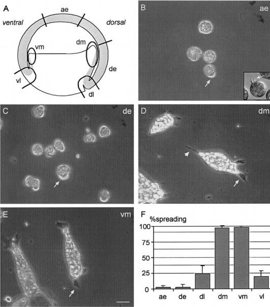and placed on fibronectin after 1 h. (A) Sketch of an early gastrula embryo. Black areas (explanted regions): dorsal mesendoderm (dm), ventral