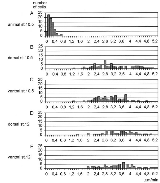 measured to calculate the average velocity in mm/min. At least 60 cells/region were traced in three experiments. (A-C) stage 10.5: (A) animal cells do not migrate. (B) dorsal mesendodermal cells and (C) ventral mesendodermal cells are highly migratory. (D and E) stage 12: (D) dorsal mesendodermal cells and (E) ventral mesendodermal cells have not changed their migratory behaviour.