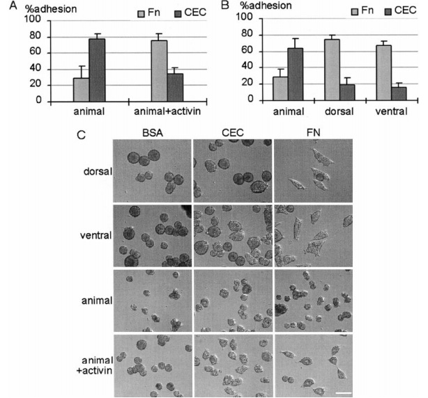 the adhesion to CEC and increases the adhesion to fibronectin. (B) The adhesion properties of dorsal and ventral mesendodermal cells are