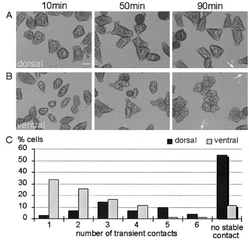 formed contacts. 90 min: Contacts have been released and new contacts with other cells have been established. Bar: 50 mm. (B) Ventral
