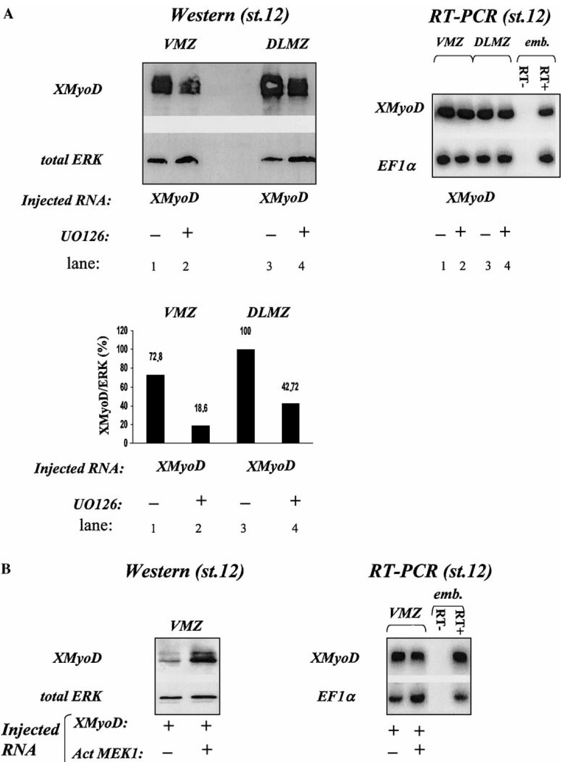 FIG. 6. Activation of MAPK increases XMyoD protein levels. (A) Protein extracts (9 explant equivalents), as described in Fig. 5B, were