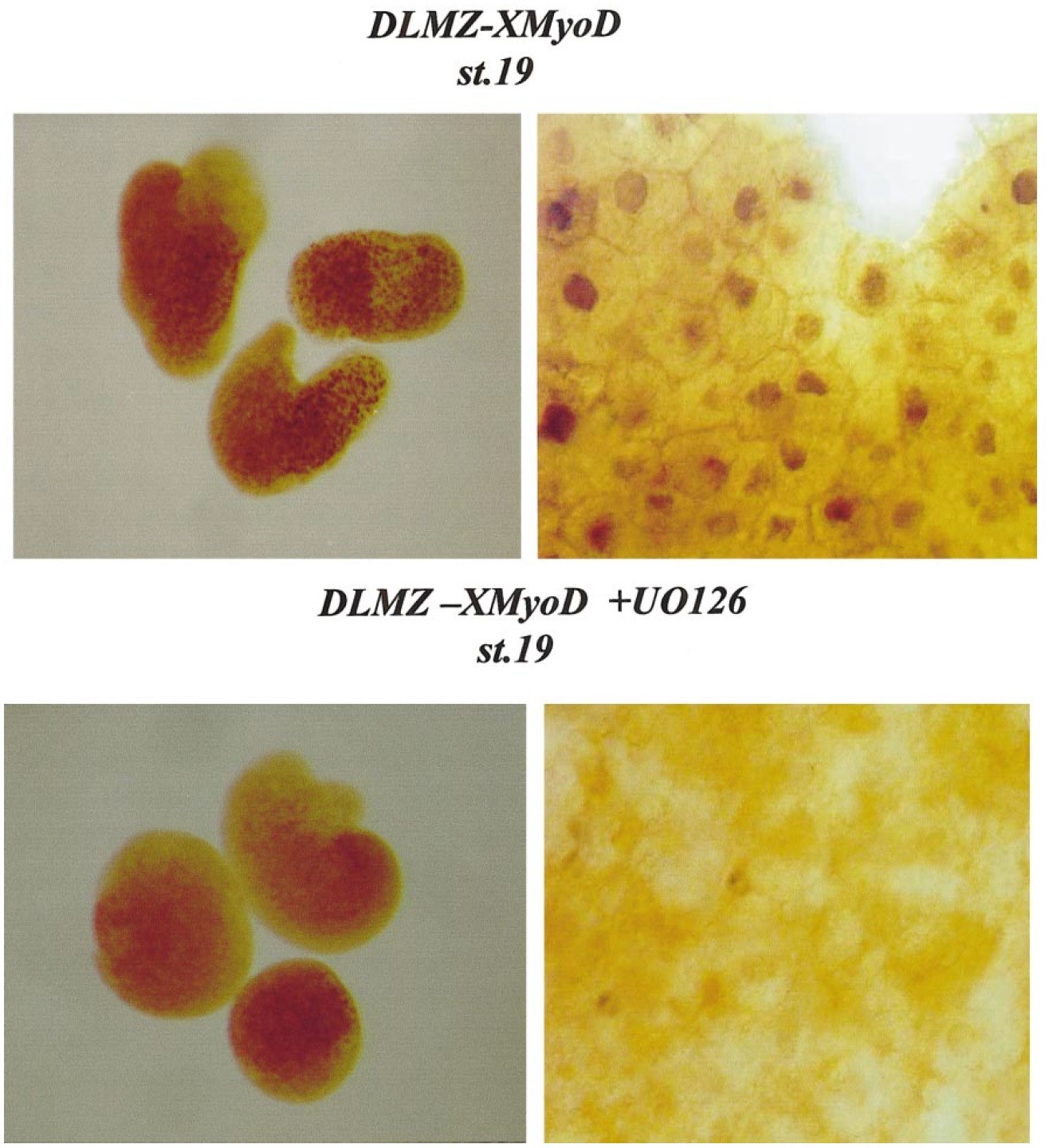 FIG. 7. Immunostaining of ectopically expressed MyoD protein following MAPK pathway inhibition. Embryos at the one-cell stage were