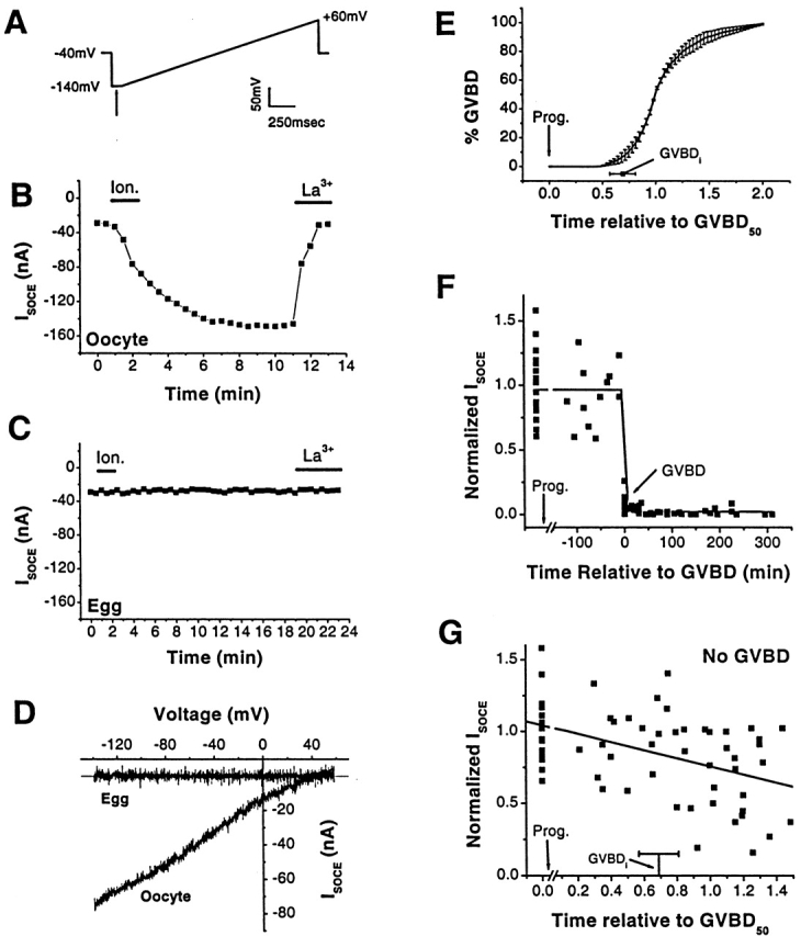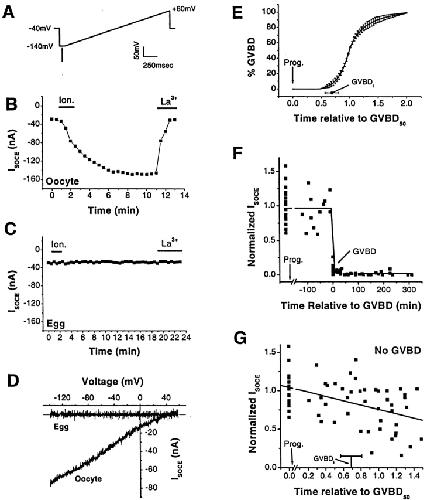 Figure 1. ISOCE during Xenopus oocyte maturation. (A) Voltage protocol used to measure ISOCE development and IâV relationship. The membrane potential was stepped to â140 mV (100 ms), and then ramped from â140 to +60 mV (2 s) from a â40 mV holding potential. The protocol was applied once every 30 s. (B and C) ISOCE development after Ca2+ store depletion with ionomycin (10 μM) in an oocyte (B) and an egg (C). Cells were injected with 7 nmol BAPTA to allow for ISOCE recording (Machaca and Haun, 2000). The current at â140 mV (A, arrow) was plotted over time. La3+ (100 μM) was added at the end of the experiment to block SOCE and obtain a measure of absolute ISOCE. (D) Representative IâV relationships obtained from the ramp voltage stimulation shown in A from an oocyte and an egg. IâV relationships were obtained by subtracting the current after La3+ addition from the current before addition. (E) Time course of progesterone-mediated GVBD. Progesterone was added to a population of at least 50 oocytes, and the occurrence of GVBD over time was recorded by following white spot appearance on the animal pole. The data shown represent the average ± SE from seven donor females. The time of GVBDi ± SD is also shown. GVBDi represents the time at which GVBD was first observed in the population. (F and G) ISOCE levels from individual oocytes at different times during oocyte maturation. Each square represents the current from a single cell. ISOCE data from oocytes are shown before progesterone addition. The data was normalized to average current in oocytes. ISOCE data from 80 cells at different times during maturation are shown in F. (G) ISOCE levels from cells incubated in progesterone without undergoing GVBD (n = 63). The average time ± SD of GVBDi is shown for reference.
