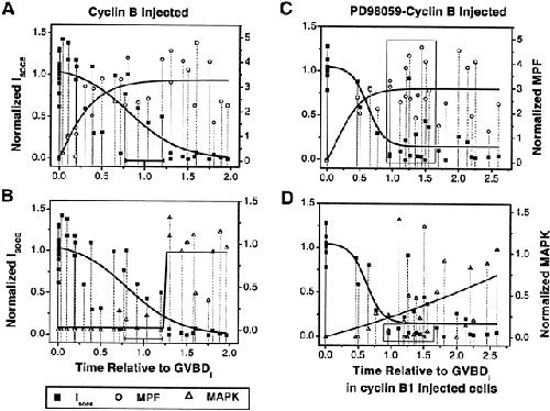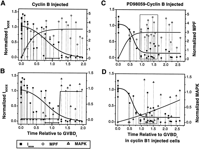 Figure 3. Correlation between ISOCE and MPF and P-MAPK levels after Δ87cyclin B1 protein injection. Oocytes were either directly injected with Δ87cyclin B1 protein (A and B) or preincubated in the MEK inhibitor PD98059 (50–100 μM) for 0.5–2 h before Δ87cyclin B1 injection. ISOCE levels were recorded at various times after Δ87cyclin B1 injection. After ISOCE recording, individual cells were lysed and assayed for MPF and P-MAPK levels. This allowed us to obtain ISOCE (squares), MPF (circles), and P-MAPK (triangles) levels from the same oocyte. The data for individual cells are connected by drop lines to help in matching ISOCE and kinase activity from the same cell. For Δ87cyclin B1 and PD98059-Δ87cyclin B1 injections, current and kinase data from 40 and 33 cells, respectively, are shown. ISOCE levels were normalized to the levels in untreated oocytes, and MPF and MAPK levels were normalized to the levels found in fully mature eggs, as described in Fig. 2. The time scale was normalized to the time at which GVBD initially appeared in the population (GVBDi) after Δ87cyclin B1 injection. The standard deviation of GVBDi is shown in A and B (n = 7). PD98059-treated cells are plotted on a time scale normalized to GVBDi in Δ87cyclin B1–injected cells (A and B). Individual cell data were fitted with a Boltzman function to obtain a general trend of ISOCE inactivation and the activation of the different kinases.