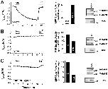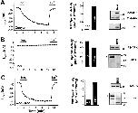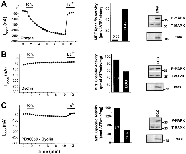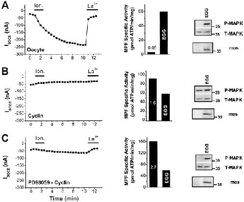 Figure 4. Representative individual cell data from Δ87cyclin B1–injected cells. MPF, P-MAPK, and Mos Western data are shown in conjunction with the levels of each kinase in fully mature eggs (EGG). (A) ISOCE was activated in response to store depletion with ionomycin (10 μM) in an oocyte, and MPF, P-MAPK, and Mos were not detected. (B) A representative oocyte injected with Δ87cyclin B1. ISOCE was not activated in response to store depletion. MPF and P-MAPK levels were 1.6 and 0.9 times those in eggs, whereas Mos kinase was not detected in this oocyte. (C) A representative oocyte preincubated with PD98059 (100 μM) before Δ87cyclin B1 injection. ISOCE was not activated in response to store depletion, MPF levels were 2.7 times higher than those found in the control egg lysate, and both P-MAPK and Mos were not detectable.