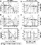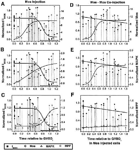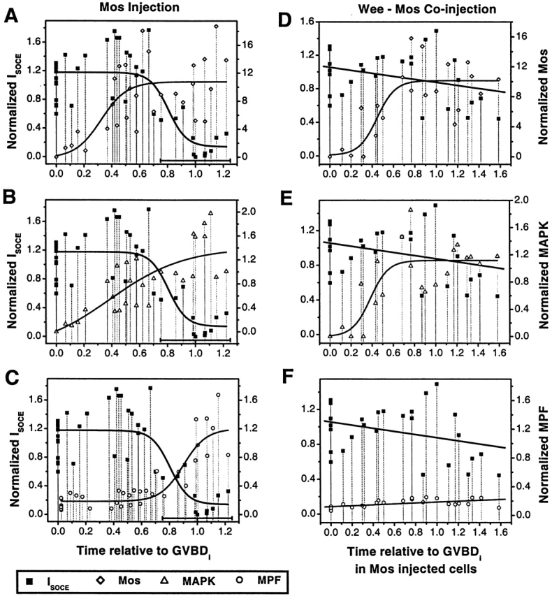 Figure 5. Correlation between ISOCE and Mos, P-MAPK, and MPF levels after injection of GST–Mos RNA. GST–Mos is a fusion protein between GST and Xenopus Mos, which allowed the separation between endogenous Mos (39 kD) and recombinant, injected GST–Mos (64 kD) (see Materials and methods). Oocytes were either directly injected with 10 ng GST–Mos RNA (A–C) or preinjected with 10 ng of GST–107Wee1 (Wee) 13–16 h before Mos RNA injection. GST–107Wee1 is a constitutively active form of the Wee1 kinase, which blocks MPF activation (Howard et al., 1999). ISOCE levels recorded at various times after GST–Mos RNA injection. After ISOCE recording, individual cells were lysed and assayed for kinase activities. This allowed us to obtain ISOCE (squares), Mos (diamonds), P-MAPK (triangles), and MPF (circles) levels from the same oocyte. For Mos and Wee1–Mos injections, current and kinase data from 40 and 27 cells, respectively, are shown. The plotted Mos data is for GST–Mos protein levels, as endogenous Mos was not detected in these experiments. The data for individual cells are connected by drop lines to help in matching ISOCE and kinase activity from the same cell. ISOCE levels were normalized to the levels in untreated oocytes, and Mos, MAPK, and MPF levels were normalized to the levels found in fully mature eggs as described in Fig. 2 and Materials and methods. The time scale was normalized to GVBDi, the standard deviation of which is shown in A–C (n = 5). Cells preinjected with GST–107Wee1 were plotted on the same time scale as GST–Mos-injected cells (D–F). Individual cell data were fitted with a Boltzman function to obtain a general trend of ISOCE inactivation and the activation of the different kinases.